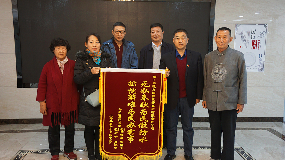 10月28日上午,市區(qū)御龍頤景小區(qū)的四位居民將一面繡有“無私奉獻(xiàn)為民做防水,排憂解難為民辦實(shí)事”的錦旗送到集團(tuán)公司,表達(dá)了對(duì)集團(tuán)公司出資解決御龍御景小區(qū)房屋漏水問題的感謝之情。